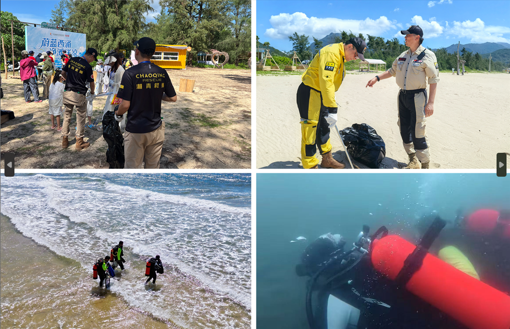 志愿者们顶着烈日,手持垃圾钳和可降解垃圾袋,细致清理沙滩及礁石缝隙中的塑料片、烟头、废弃塑料袋等各类垃圾,并分类回收可循环物资。专业潜水人员身着潜水装备潜入海底,将藏匿在水底缝隙、缠绕在水下设施中的塑料袋、饮料瓶等垃圾——打捞上岸。