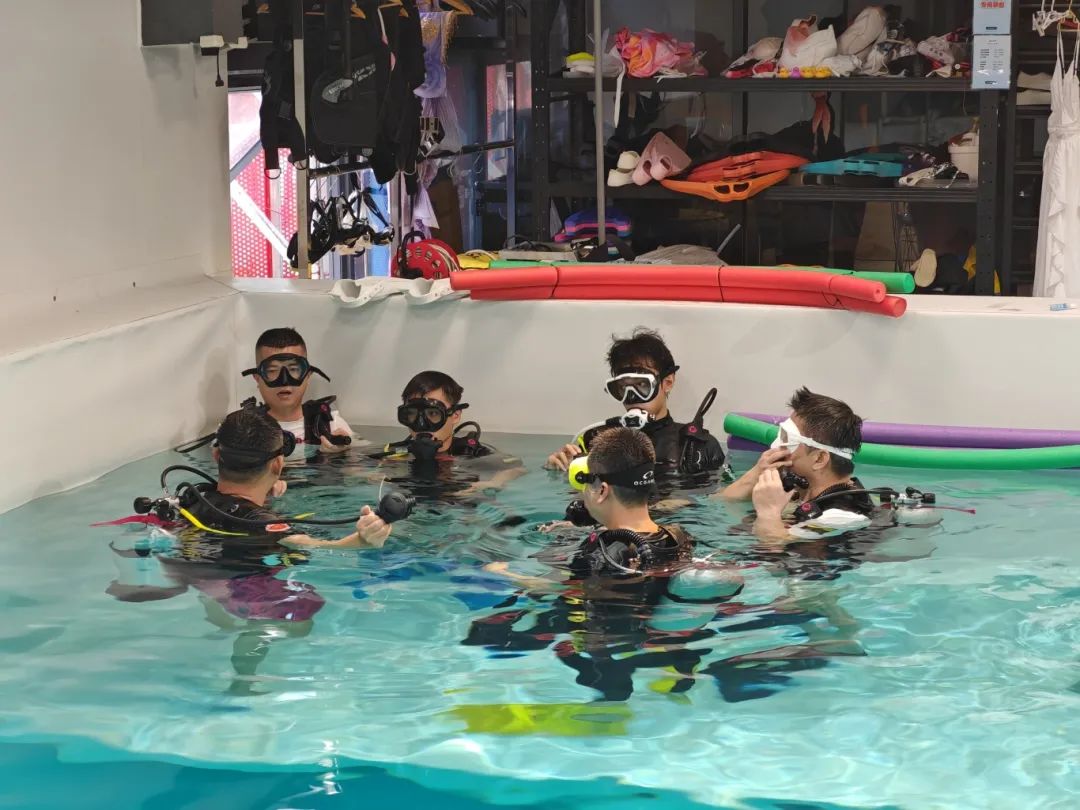 进入深水区救援基础技巧训练,水域安全训练官指导队员们进行中性浮力水下游动、无能见度证物巡回等动作练习,讲解了使用dpv水下推进器救援操作、紧急情况下交换呼吸器操作、水下装备穿戴互换以及有控制紧急上浮等技巧。