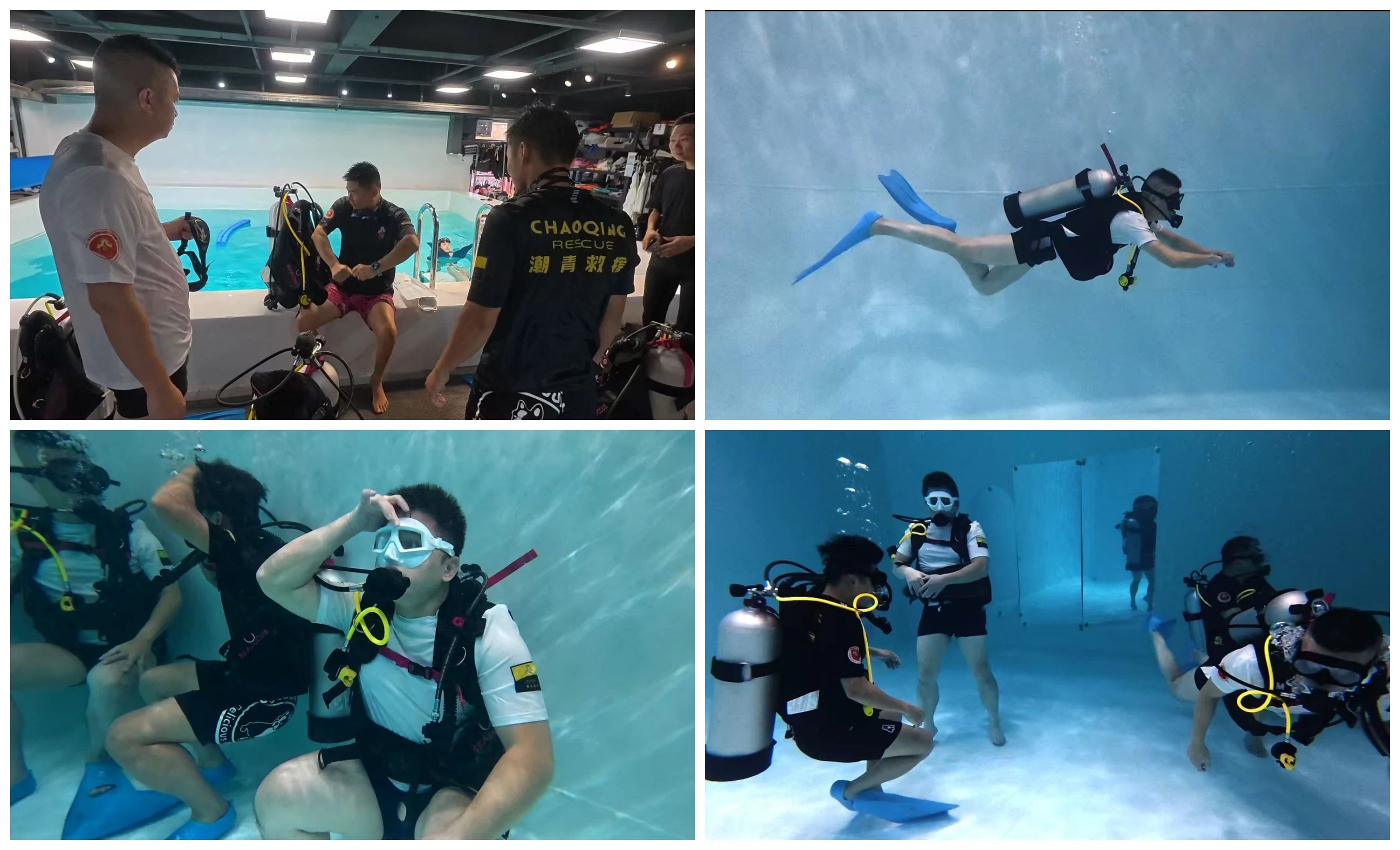 实操环节以情景式、互动式的教学方法开展。在低洼地带救援训练中,队员们学习了使用控制浮力背心(BCD)、水下呼吸技巧、水下平衡耳压技巧等基本技能,通过进行调节器排水技巧、调节器二级头寻回技巧、水下面镜排水技巧以及水面伤员拖带技巧等实操演练,进一步提升了在复杂水域环境下的自救与互救能力。