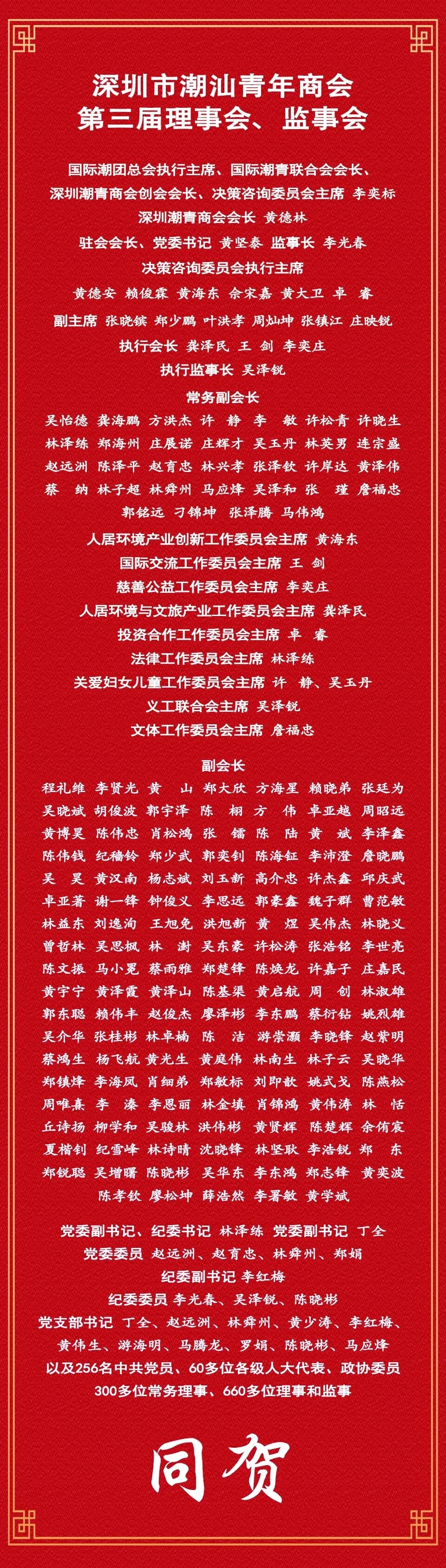 国际潮团总会执行主席、国际潮青联合会会长、深圳潮青商会创会会长、决策咨询委员会主席李奕标