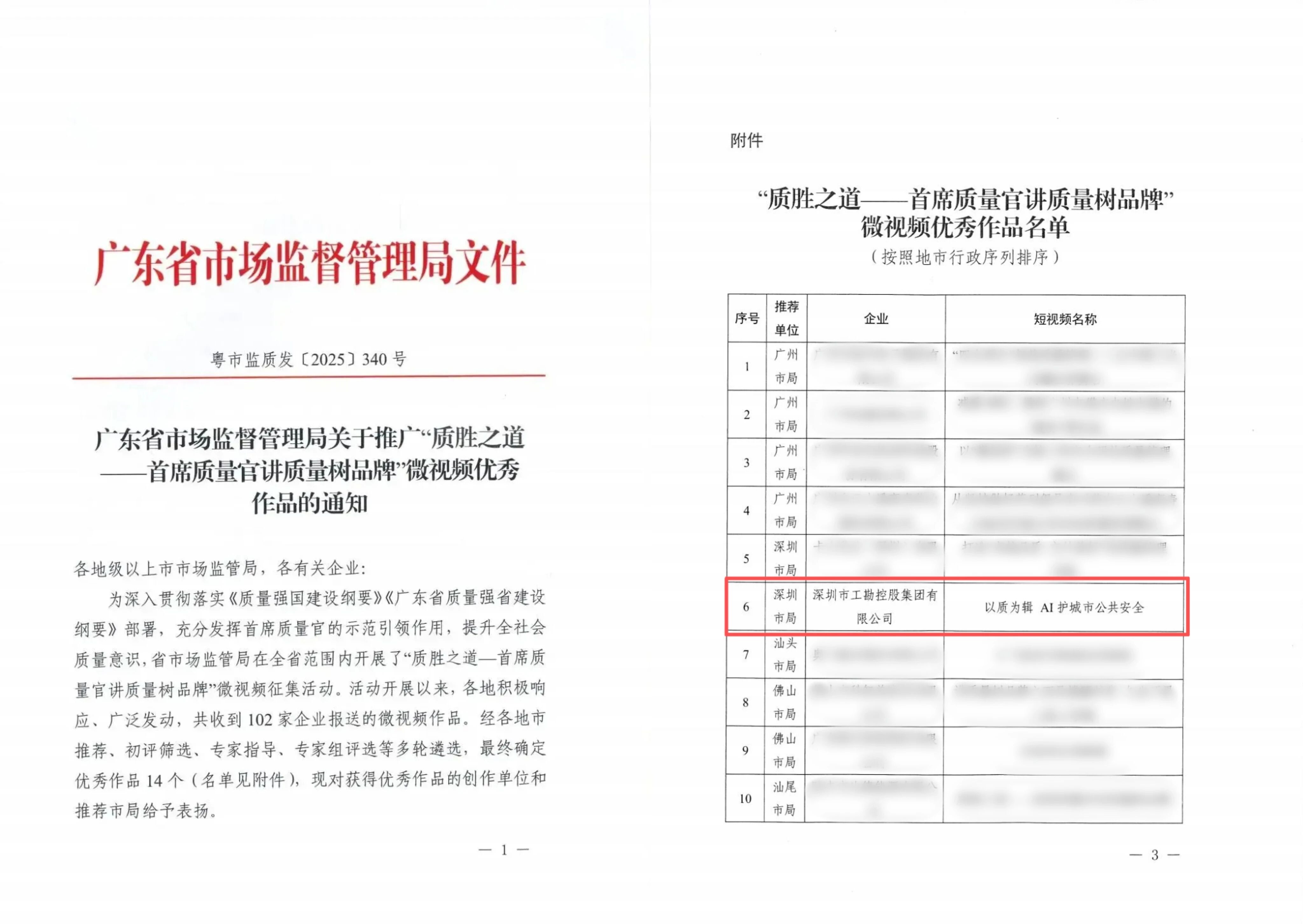 近日,广东省企业首席质量官经验交流活动暨“质量月”启动仪式在广州举行。启动仪式上,省局党组成员、副局⻓郭宇华发布了“质胜之道——首席质量官讲质量树品牌”微视频优秀作品。其中,深圳潮青商会名誉会长林强有、副会长林诗晴企业深圳市工勘岩土集团有限公司报送的《以质为辑,AI护城市公共安全》微视频作品经过激烈角逐,通过多轮遴选,最终脱颖而出,成功获评省级优秀作品,在全省推广展示。