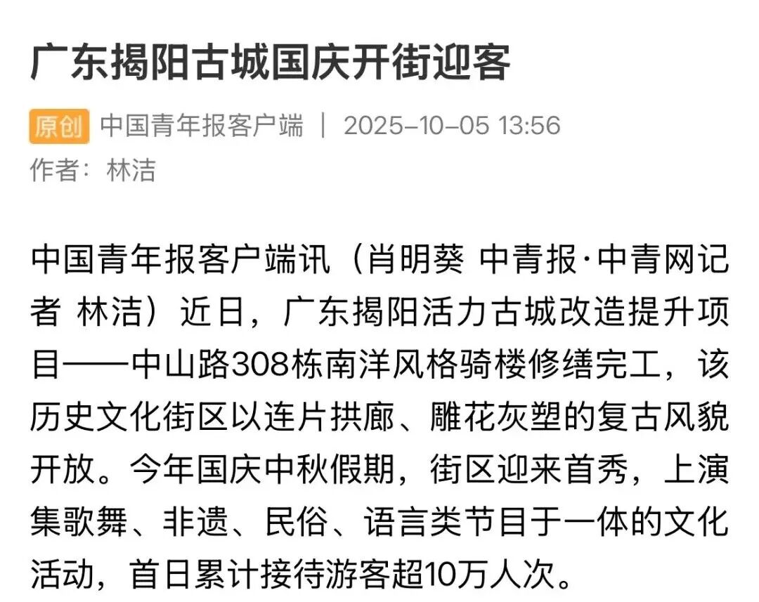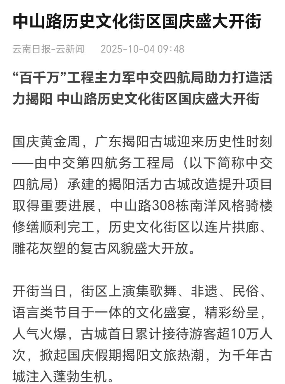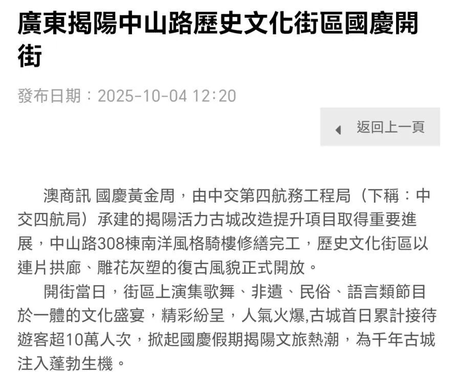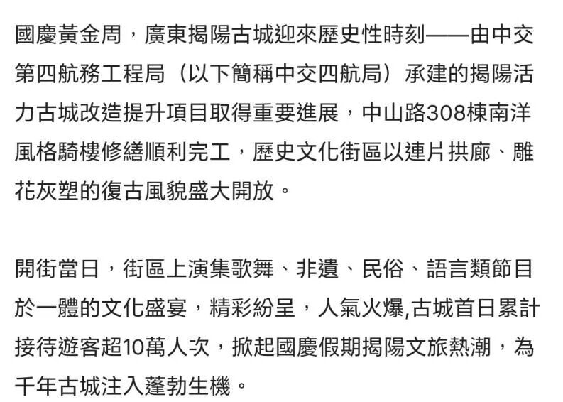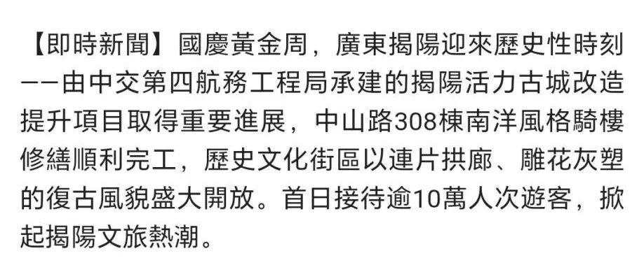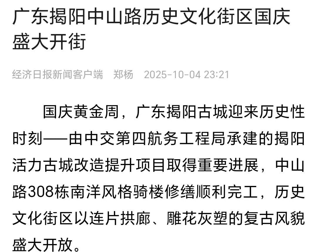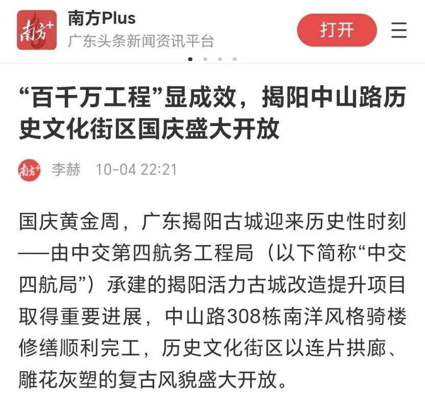 近期,由中交四航局(联合体牵头人)、深圳市潮汕青年商会副会长纪雪峰企业广东纪传英古建筑营造有限公司(联合5体成员)参与的广东揭阳活力古城改造提升工程取得重大进展,中山路历史文化街区顺利开街,受到人民日报、光明日报、科技日报、经济日报、环球网、中国日报网、中国新闻网、中国青年报、中国交通新闻网、中国水运网、北京日报、云南日报、南方+、羊城晚报、澳门有线电视、澳门商报、市民日报、濠江日报等二十余家主流媒体的关注报道,并在《广东建设报》见报。