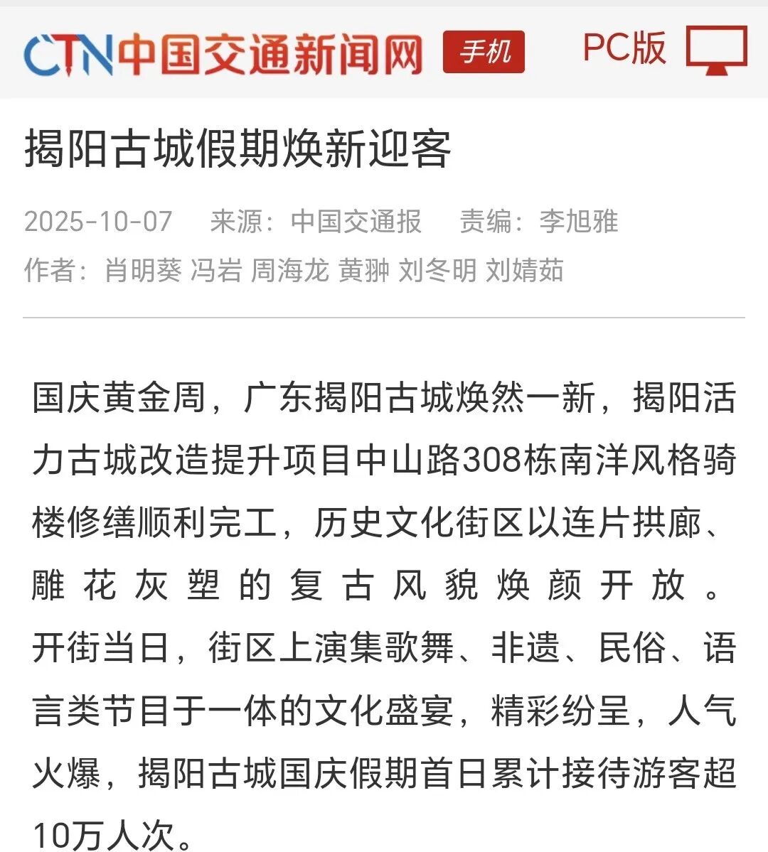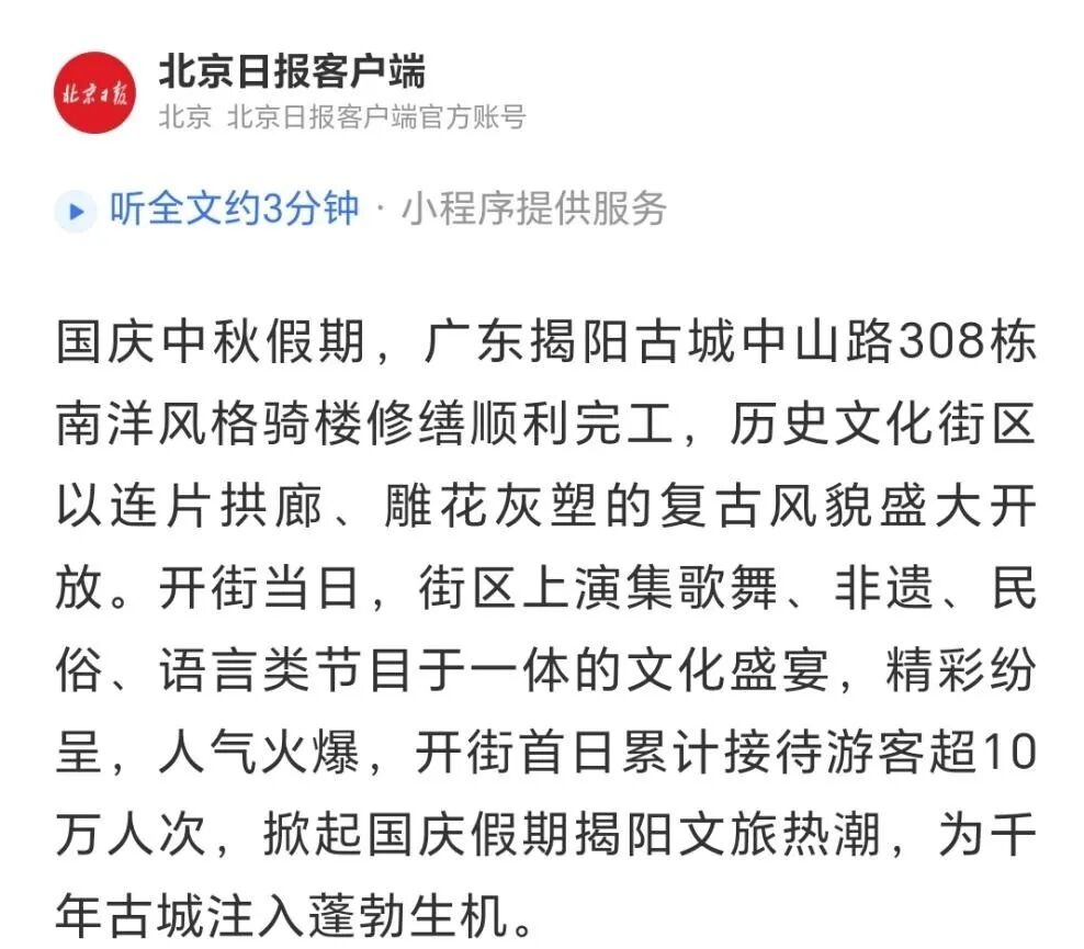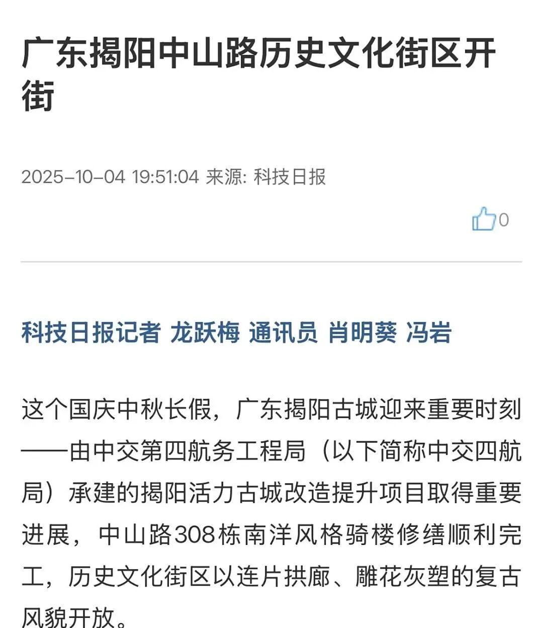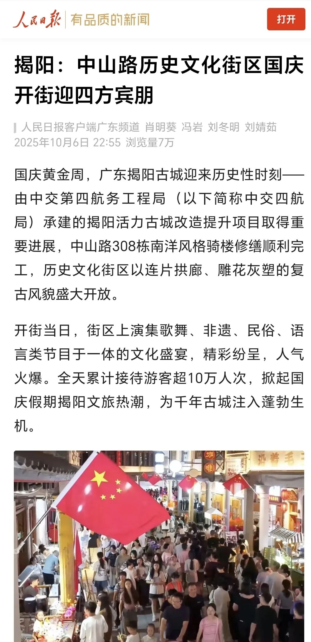 近期,由中交四航局(联合体牵头人)、深圳市潮汕青年商会副会长纪雪峰企业广东纪传英古建筑营造有限公司(联合5体成员)参与的广东揭阳活力古城改造提升工程取得重大进展,中山路历史文化街区顺利开街,受到人民日报、光明日报、科技日报、经济日报、环球网、中国日报网、中国新闻网、中国青年报、中国交通新闻网、中国水运网、北京日报、云南日报、南方+、羊城晚报、澳门有线电视、澳门商报、市民日报、濠江日报等二十余家主流媒体的关注报道,并在《广东建设报》见报。
