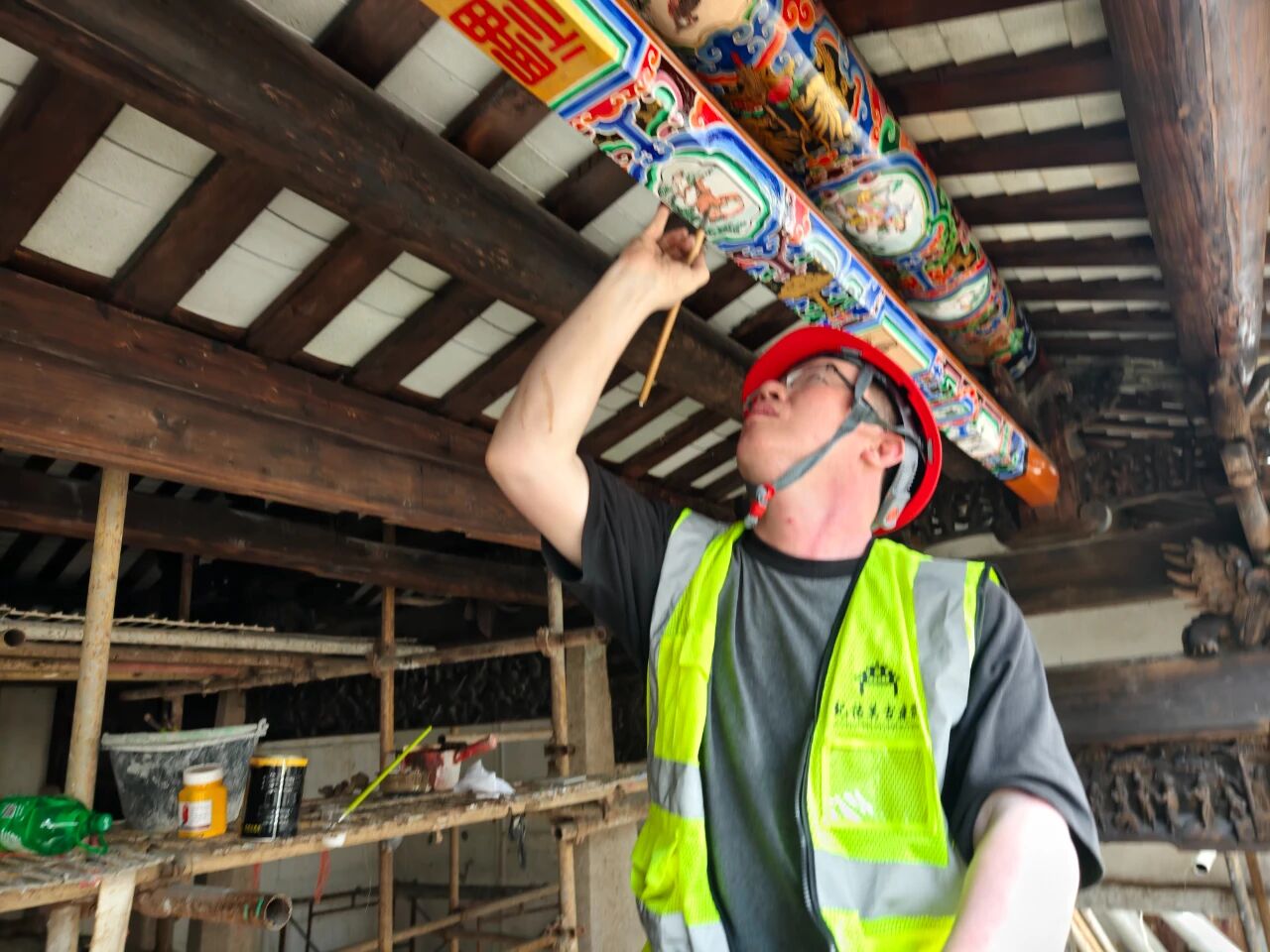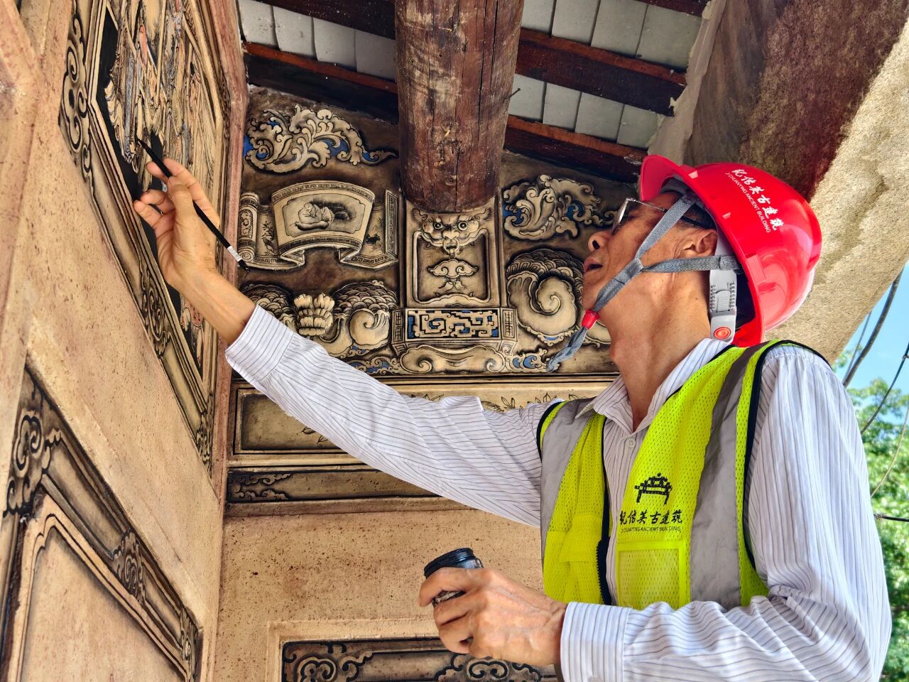 针对灰塑、嵌瓷等非遗技艺,纪传英古建筑团队发挥专业优势,联合国家级、省级、市级非遗代表性传承人,广东省传统建筑名匠,省级、市级工艺美术师,遵循古法工艺,沿用传统材料,并融入现代工艺加固,重现“金木水火土”五行山墙等古建筑营造技艺,让非遗技艺在百年古厝间重绽光彩。