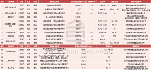 截至2023年7月30日(周日),已列入城市更新计划项目1017个,拆除范围面积累计8627h㎡;已通过城市更新专规批复项目672个,计容建筑面积累计21344.2万㎡;按数量规划通过率66.1%,按规模规划通过率62.9%;实施主体公示项目509个,拆除范围面积累计3216.8h㎡;按数量计划实施率50.1%,按规模计划实施率37.3%。