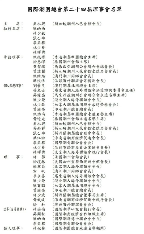2025年11月30日,国际潮团总会2025年度会员大会在潮州国际会展中心召开。会议正式通过国际潮团总会第二十四届理事会名单。新加坡潮州八邑会馆会长吴木兴接任国际潮团总会主席,陈幼南、林少毅、张乙坤、李奕标、林少华、林辉勇任国际潮团总会执行主席,李奕标兼任秘书长;林梅、林涛、黄坚泰任国际潮团总会执行秘书长。