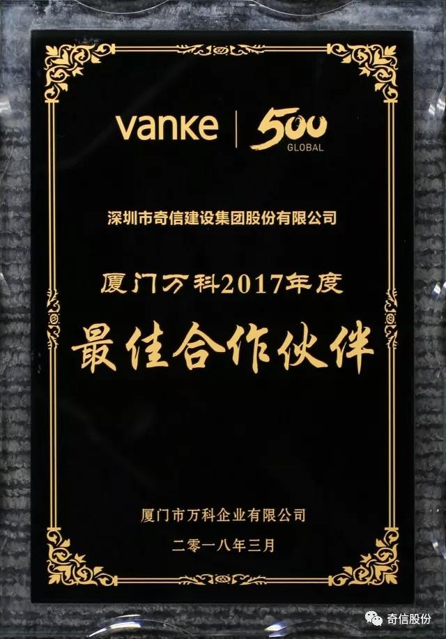 奇信股份荣获厦门万科“2017年度最佳合作伙伴”称号