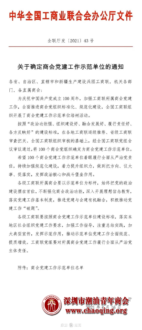 为庆祝中国共产党成立100周年,加强工商联所属商会党建工作,全面推进商会党组织标准化、规范化建设,全国工商联组织开展了商会党建工作示范单位培树活动。深圳市潮汕青年商会党委的上级党委——深圳市潮汕…