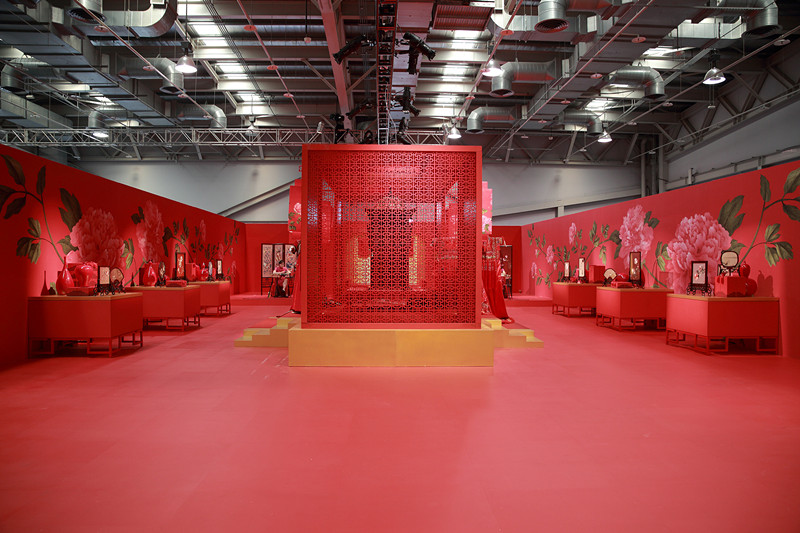“锦绣长红”馆被大红色的喜庆气氛包围,走进馆内,踩上红毯,宛如参加一场梦幻的中式婚礼。馆内点缀着各种刺绣作品:牡丹刺绣灯笼、中式新娘嫁衣、双面刺绣屏风……件件美不胜收。此次展览的刺绣全部来自“苏州刺绣研究所”,充分展现苏绣之美和其高超技艺。展览期间,除了众多的国宝级藏品展示之外,还有高级工艺美术大师现场示范精湛的刺绣艺术工艺,令人大开眼界。