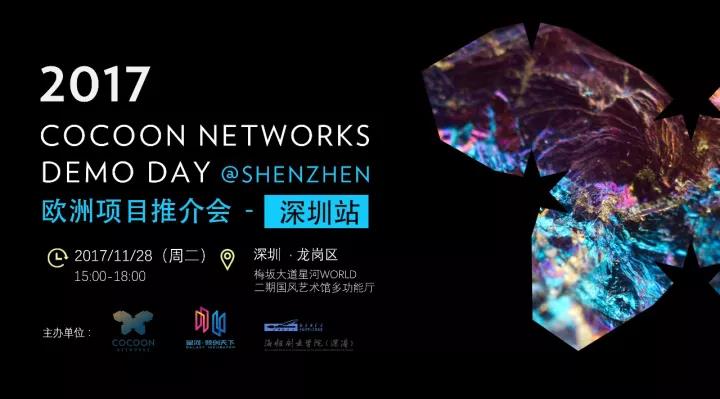 由Cocoon Networks、星河·领创天下和海归创业学院(深港)带来从欧洲跨国漂流而来的八个项目团队将在11月28日(周二) 15:00 -18:00于深圳市龙岗区梅坂大道星河WORLD二期国风艺术馆多功能厅举办Cocoon Networks Demo Day @Shenzhen - 欧洲项目推介会- 深圳站。