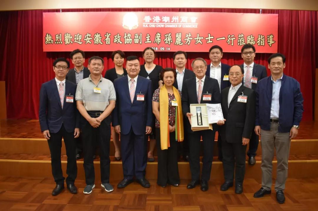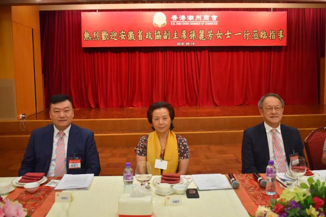 安徽省政协副主席孙丽芳表示,今次到访香港潮州商会,不仅是探望安徽省推选的全国政协委员——胡剑江永远荣誉会长,亦是来商会同林宣亮会长等新朋友交流学习的。今次到访香港潮州商会,收获很多。她又表示,安徽省近年来参与长江经济带建设,重视发展创新科技产业,在基础设施建设方面投入很多,交通的便利令区位优势更加凸显。本会和安徽省去年签署「合肥侨梦苑合作协议」,让双方关系更上一个新的台阶。她希望双方继续加强合作,优势互补,亦欢迎本会首长到访安徽,考察学习,寻找商机,共同促进两地的繁荣进步。她亦衷心祝愿本会和安徽省未来的合作愉快。