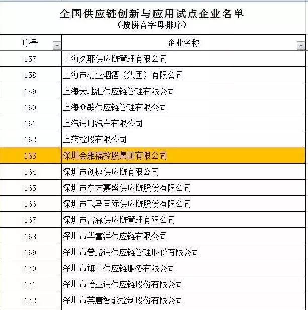 9月21日,全国供应链创新与应用试点城市和企业评审结果公示,深圳金雅福控股集团有限公司入选“全国供应链创新与应用试点企业”名单,这是金雅福控股集团获得中国民营企业500强、中国民营服务业100强后再次获得的全国性殊荣。