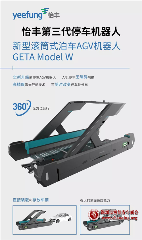 怡丰重点展示的第三代停车机器人——新型滚筒式泊车AGV机器人GETA Model W,不需要任何辅助介质,即可直接对车辆进行装载和存放;能轻松适应各种复杂恶劣的停车场环境;定位精度±5mm,可精准定位车辆和停车位;可根据停车场环境及停车位情况,在前进、后退、转弯、自旋、横移间自动切换;可在自动停车和自助停车间无障碍切换,因此可根据停车场的实时情况,随时改变停车位的分布,灵活设置车位。