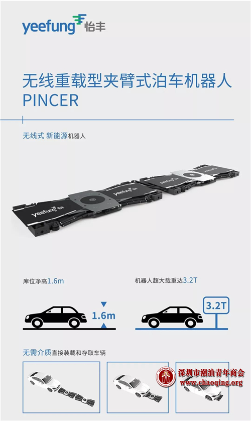 在智能立体车库中占据重要地位的怡丰无线重载型夹臂式泊车机器人PINCER,配备新能源动力,无需插电即可行走;超薄身型,机身净高仅为107毫米;普通轿车库位仅需1.6米库位净高,大大节省垂直空间;拥有超大载重,载重量可达3.2吨;自动适应车辆轴距,轴距范围2320~3560mm。