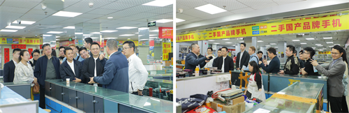 最后,代表团参观了商会副会长薛浩然旗下龙珠国产旧手机市场。据介绍,该市场成立于2017年,扎根深圳华强南片区数余载,专注于国产品牌二手手机的回收、检测、销售、维修、拆解及租赁业务,是国内领先的二手电子交易专业市场,年废旧手机回收量位居全国前列,有力推动了电子废弃物的循环再利用,积极响应国家绿色低碳发展战略。龙珠国产旧手机市场位于南园街道华强南中心地带,而华强南是全国规模最大、生态链最完整的消费电子二手商品集聚地。在这片仅0.6平方公里的区域内,密集分布着35个专业市场,聚集了超过8000家商户和2万多名从业者,高峰时期日人流量超过8万人,年交易额突破200亿元。近年来,南园街道牵头成立电子通讯设备行业协会,发布全国首套《通信网络终端维修服务规范》,并推动区内35个二手消费电子市场整合升级。作为福田区通讯设备行业协会副会长单位,龙珠国产旧手机市场深度参与行业标准制定,积极推动二手电子交易规范化发展,在行业内发挥着重要的引领作用。如今,采货侠、天天速收等头部平台相继入驻,通过商品溯源、合规检测等数字化赋能,让“华强南”成为消费电子循环经济的标杆。