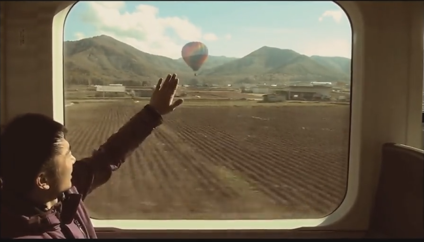 所以当乘客触碰火车窗口时,窗外:热气球会升起,小车轰隆隆的开着,飞机会冲上云霄,小男孩开心的吹着彩色的泡泡,愉快的放着鸽子......